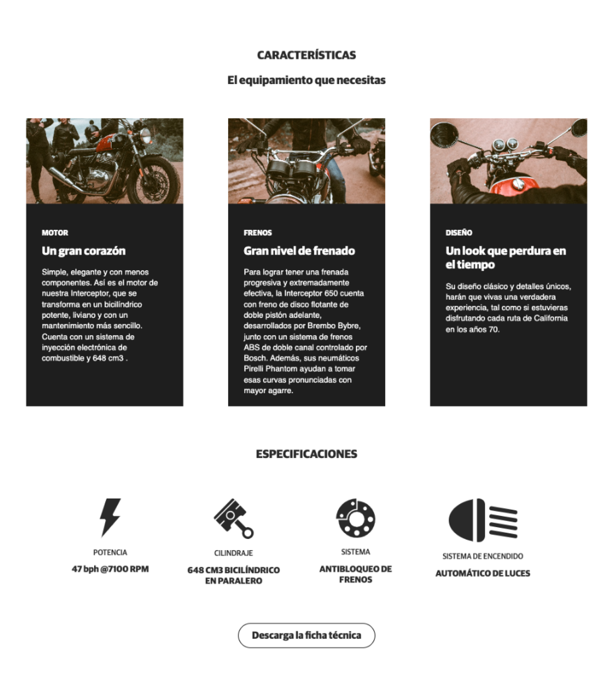 Se propuso una sección de características para cada uno de los modelos, donde desarrollé contenido referente a las especificaciones técnicas de ellos, como el tipo de motor, sistema de frenos, y diversos complementos incluidos.