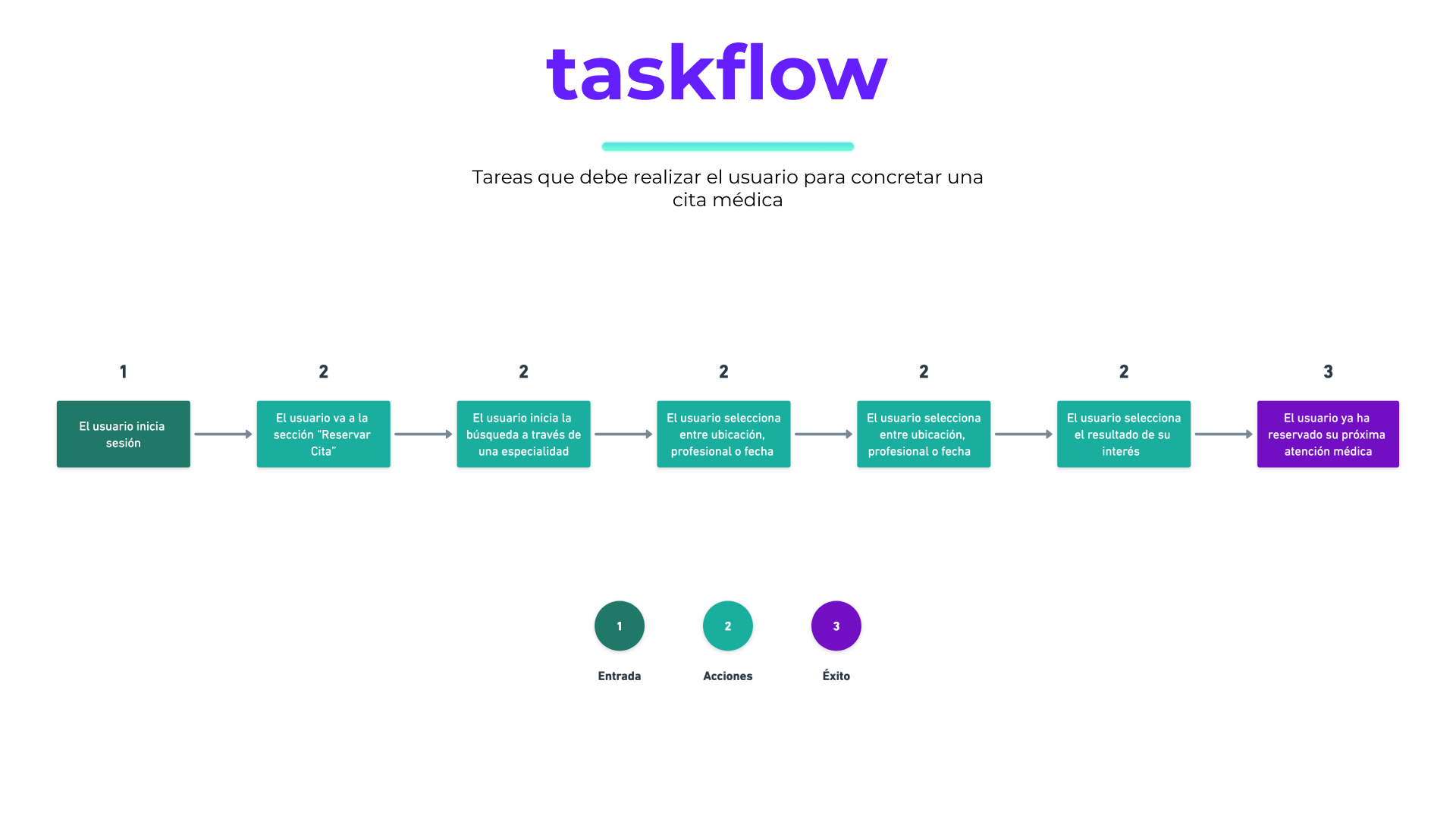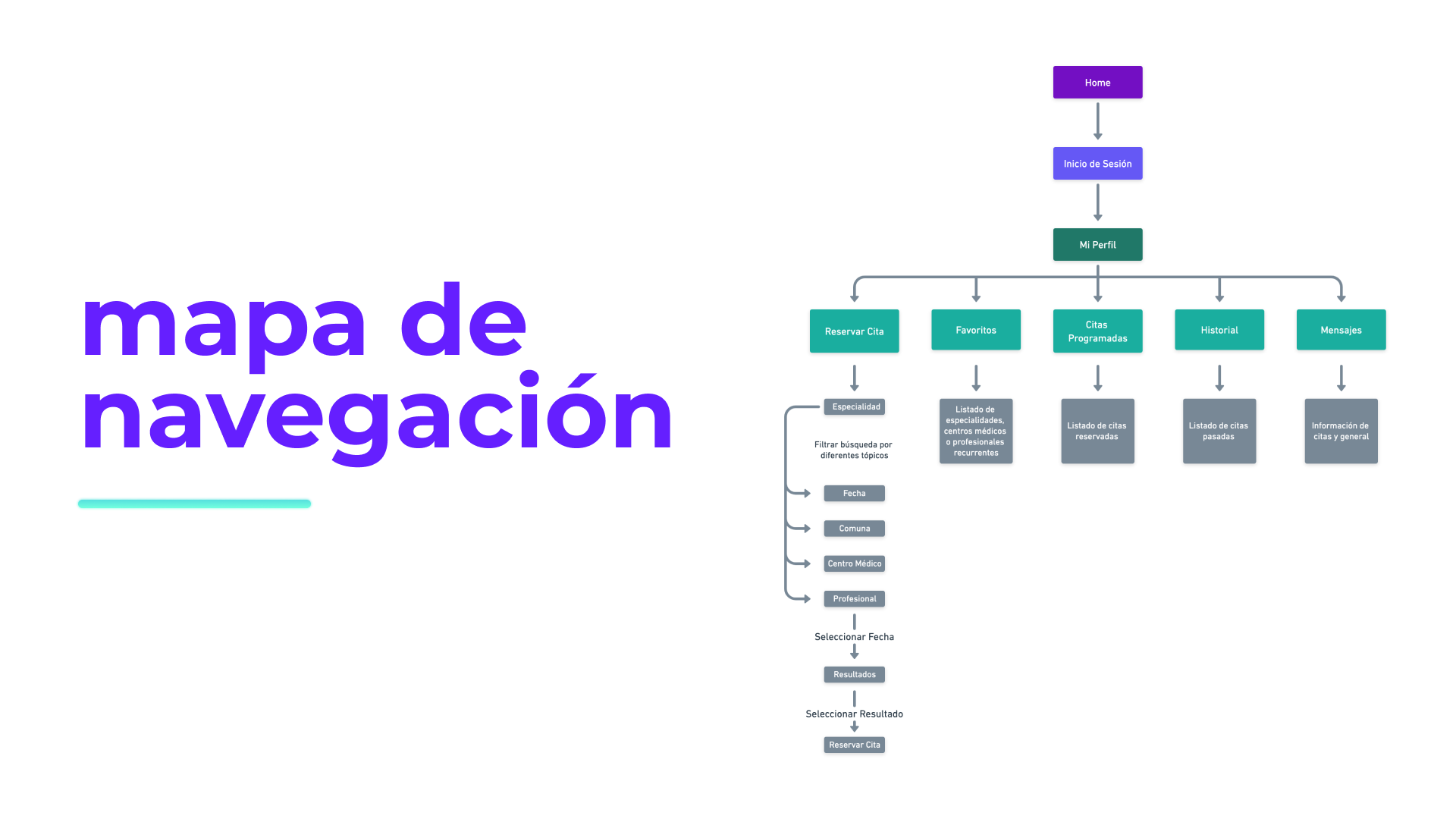 Usando los datos y resultados de la etapa anterior, armé el mapa de navegación de toda la app, sumado de un taskflow con las tareas para reservar una hora médica, y un userflow de un usuario que tiene el mismo objetivo.