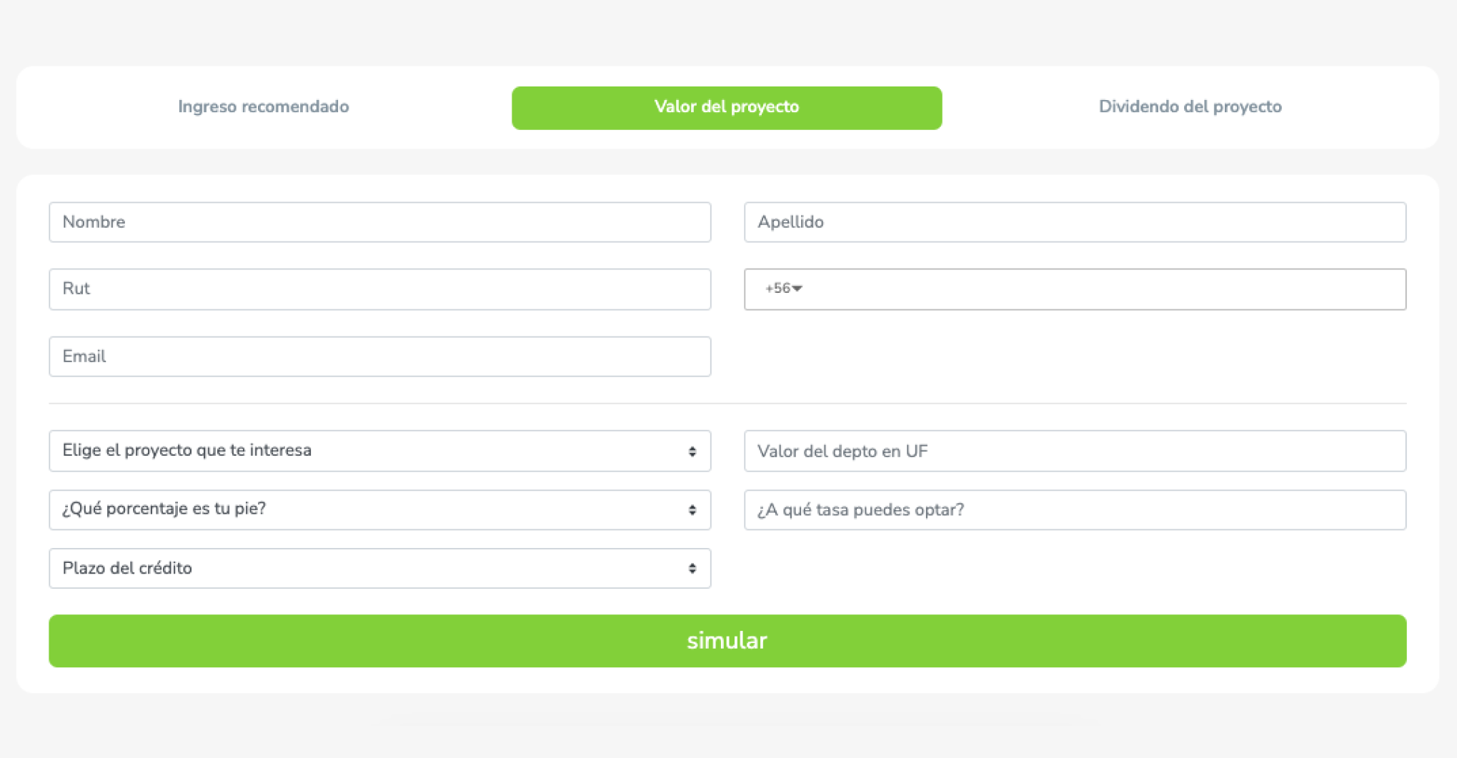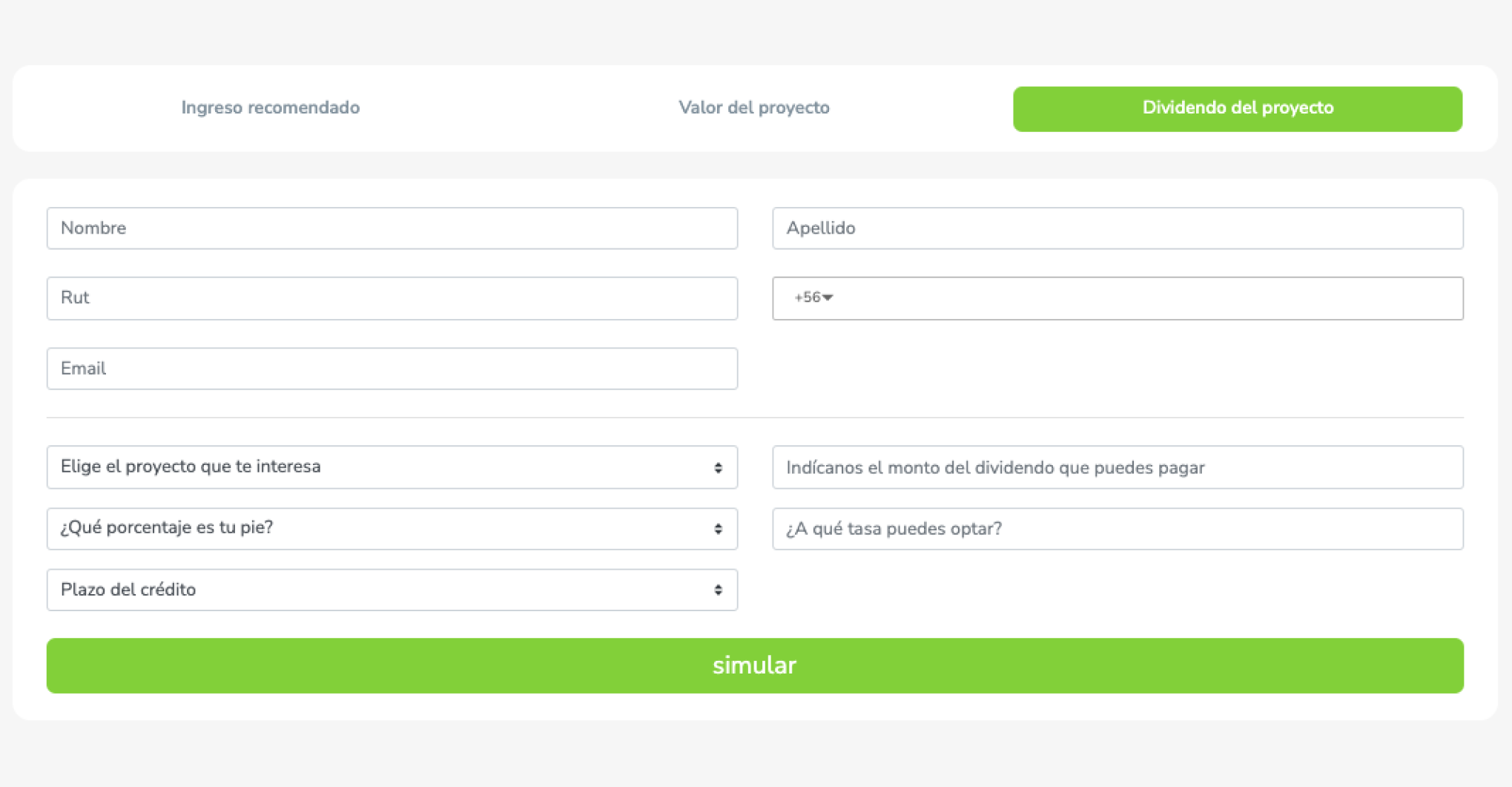 La idea era poder orientar a los usuarios en el cálculo de su próxima inversión. Los temas elegidos fueron ingreso recomendado para optar a algún proyecto, valor del proyecto, y dividendo. Con esta información más clara, cada usuario podía revisar sus opciones y tomar la mejor decisión de compra.